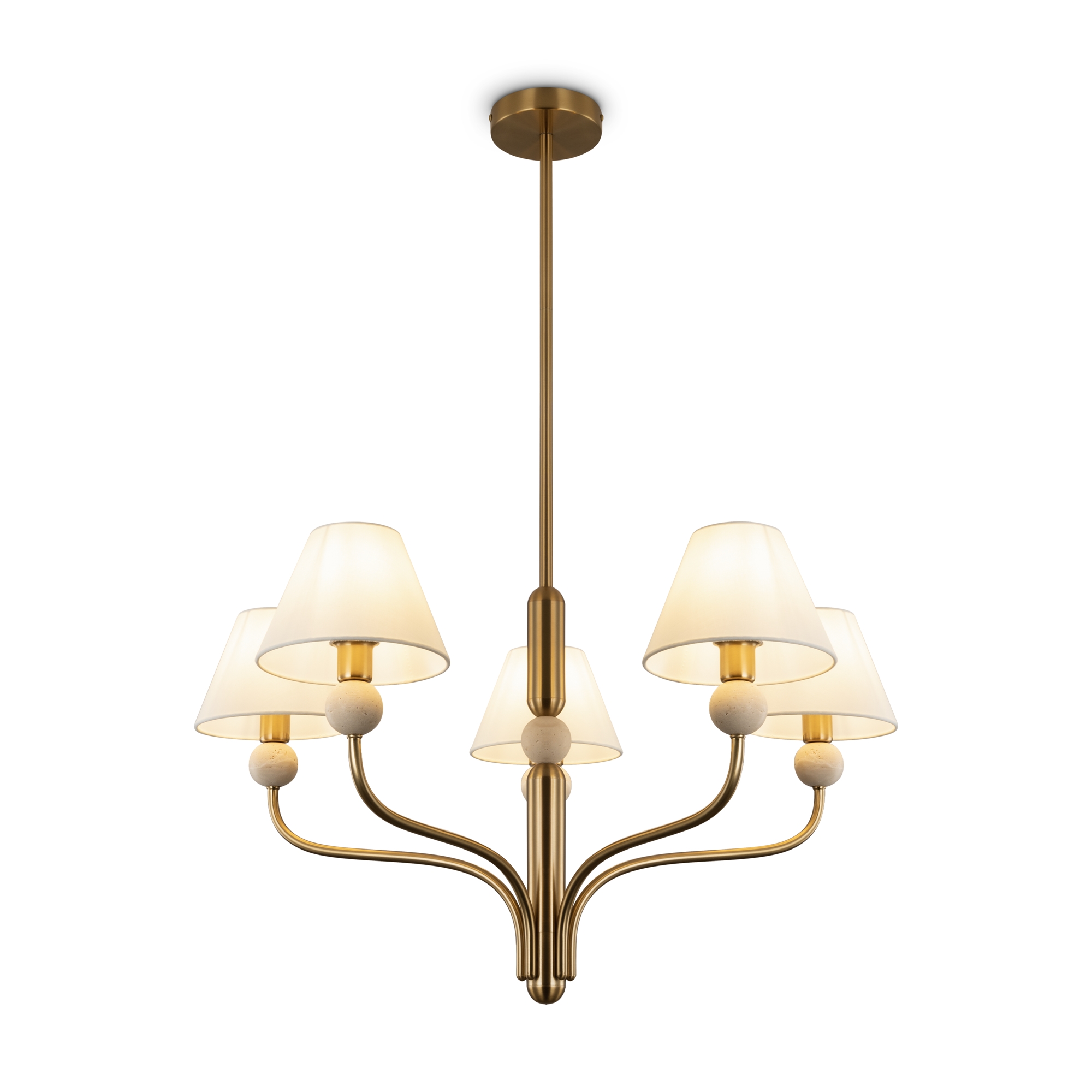 Арматура - металл в цвете латунь. Тканевые абажуры, травертиновые элементы. Лампы E14 (в комплекте). Серия состоит из люстры c 5 плафонами и бра. Трендовое сочетание в классическом стиле. |