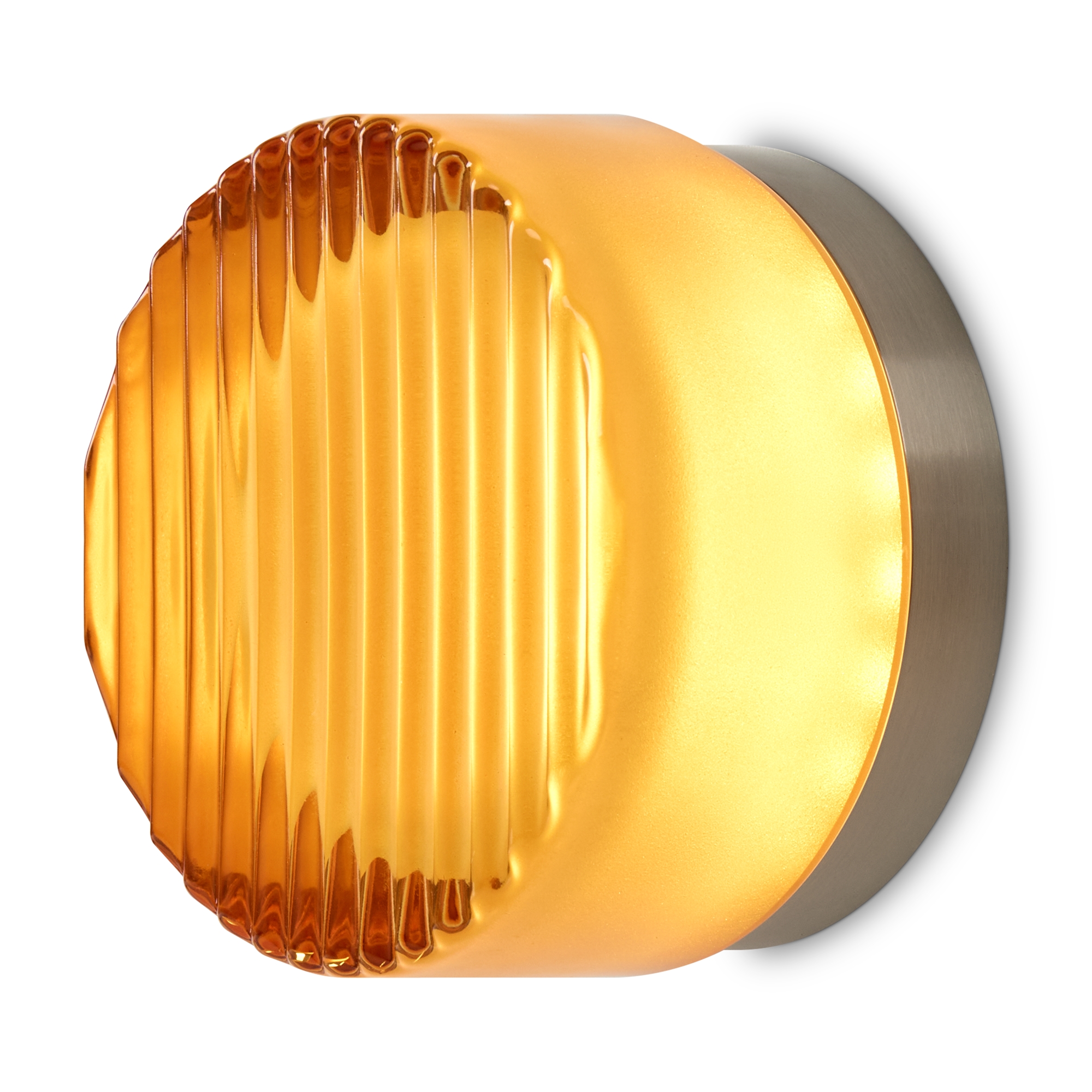 Металлическая арматура в цвете никель в трех рельефных основаниях. Плафоны, выполненные в приглушенно пшеничном и янтарном оттенках, доступны в двух размерах. LED источник света 2400К/2550К/3000K. |