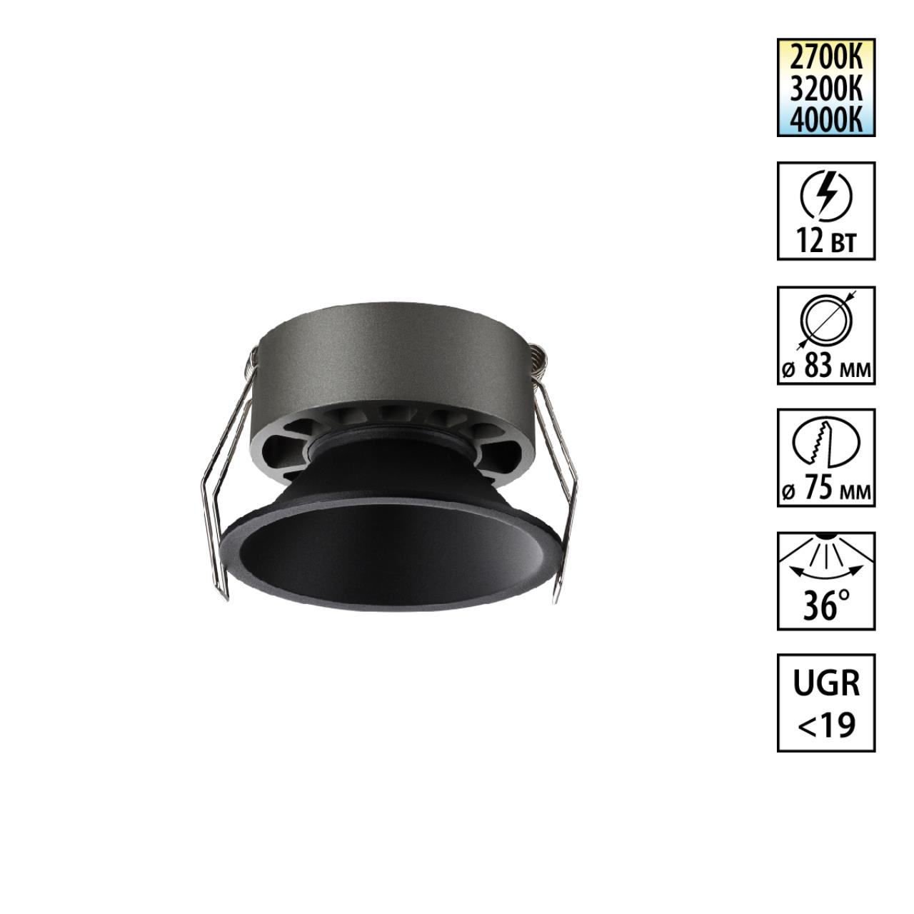 359852 WIR NT25 506 черный Светильник встраиваемый с переключателем цв. температуры IP20 LED 12W 220-240V 2700К\3200К\4000К NOVA |